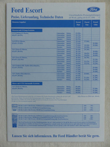 Ford Escort Limousine Turnier - Preisliste MJ 1997 - Prospekt Brochure 07.1996